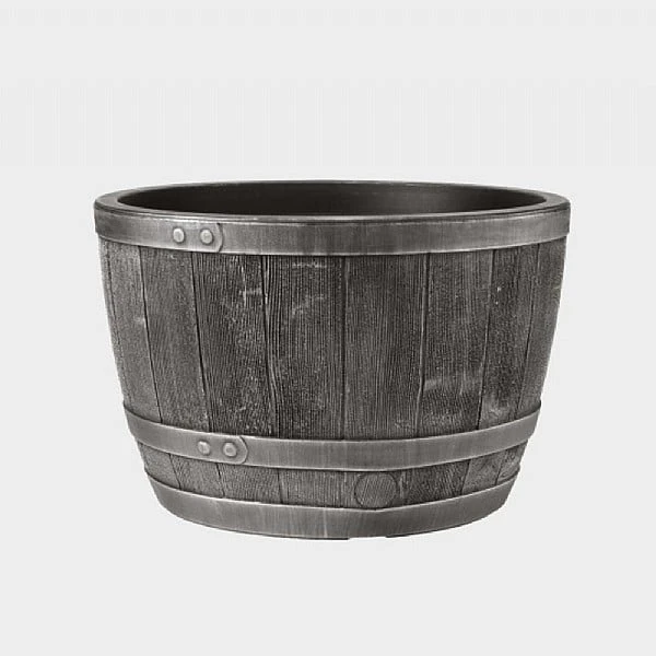 - The Stewart Garden Company’s Blenheim Half Barrel Planter 40cm Pewter is a beautiful planter, made to look just like a real wooden barrel with three bands of pewter